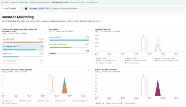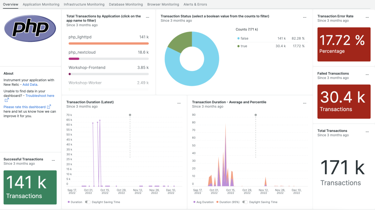 Our PHP agent collects and analyzes application data that drive data-driven decisions. Organize data, query data using NRQL, and visualize data (in customizable interactive dashboards) that directly impact customer experiences.